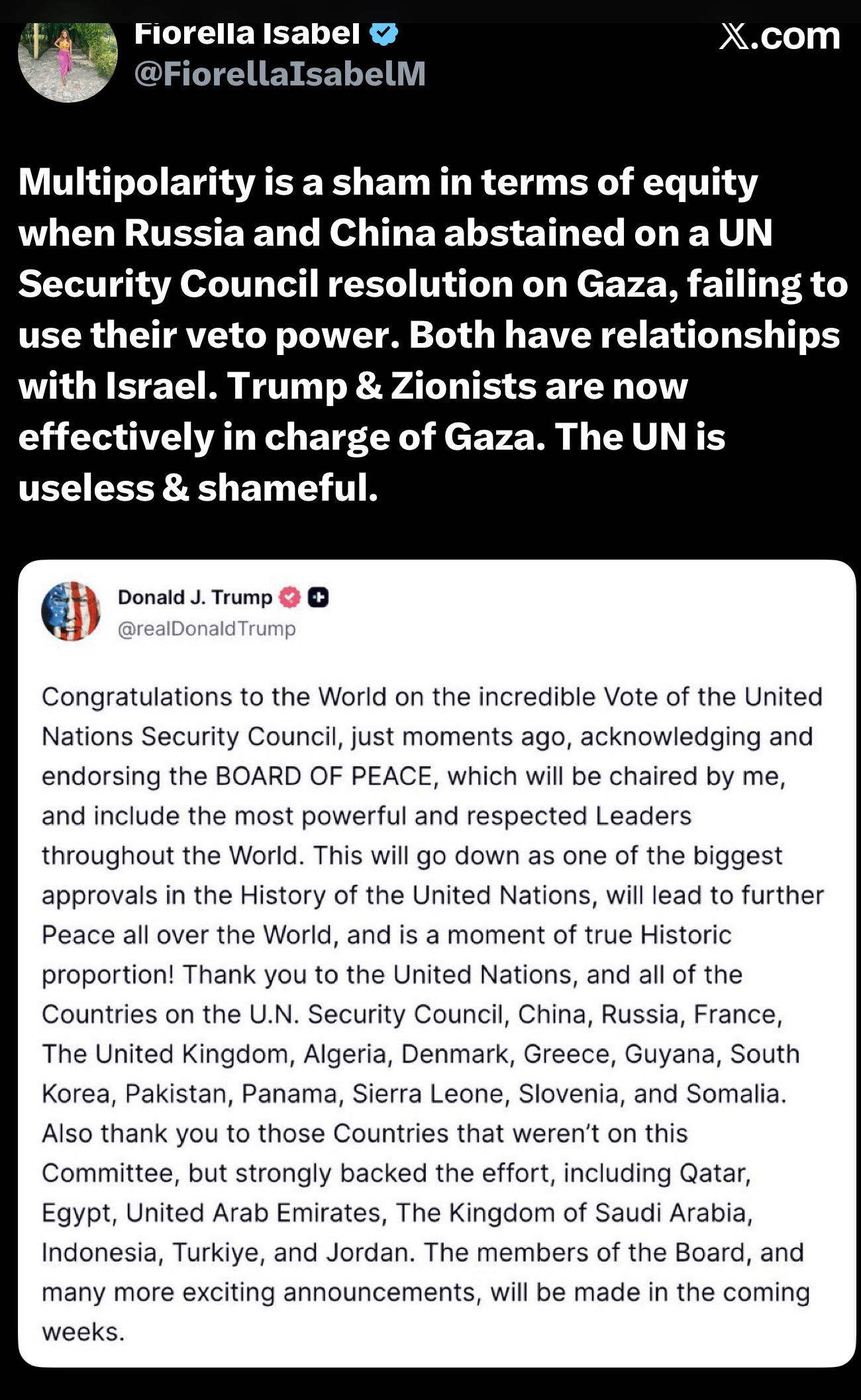 Other defenses suggest that Russia and China are playing “5D chess, ” which 0 evidence as to having done this before, or that a veto would have changed nothing and it was meaningless, well which it? The veto made it LEGAL for Trump and Zionist Israel to do with Gaza as they please. “But do you think they would suddently respect international law?” No, we don’t, but do they now? No. And if the veto was not important, why not simply do it? They cannot answer this. Even a symbolic veto would have maintained a shred of integrity in the international system and denied the resolution the legitimacy that Donald Trump promptly thanked them on social media for providing.